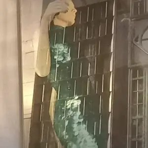 A captivating scene unfolds in a store window as a chic mannequin takes center stage, infusing an air of mystery into the surroundings. The unaltered image, printed on brushed aluminum, depicts a spectral figure seemingly suspended, hovering over a building.