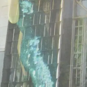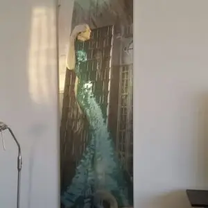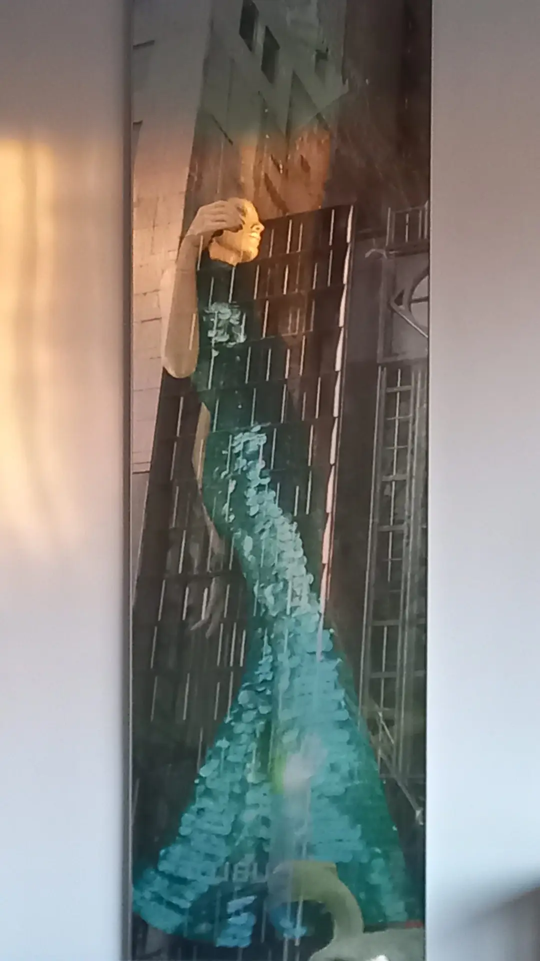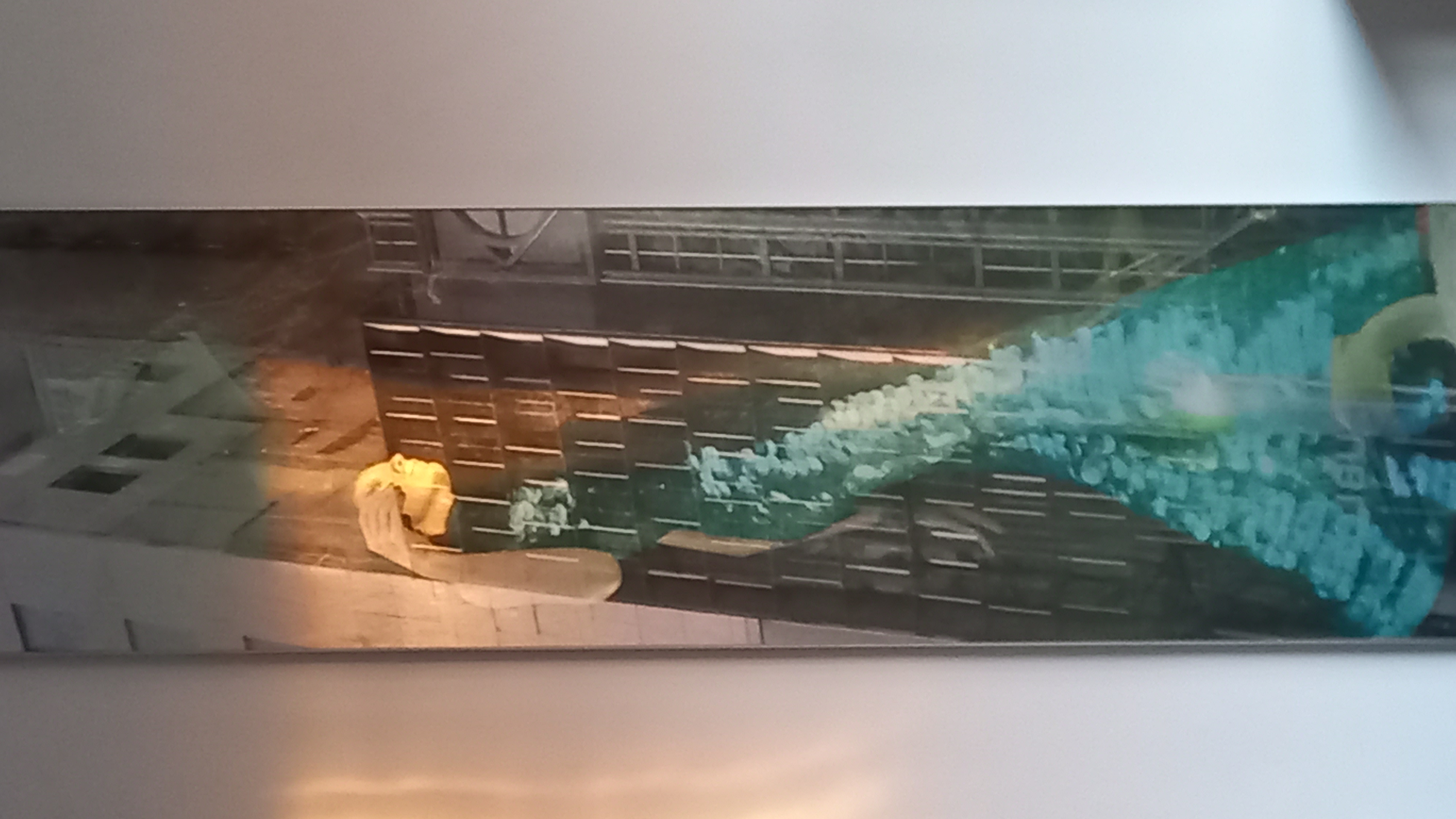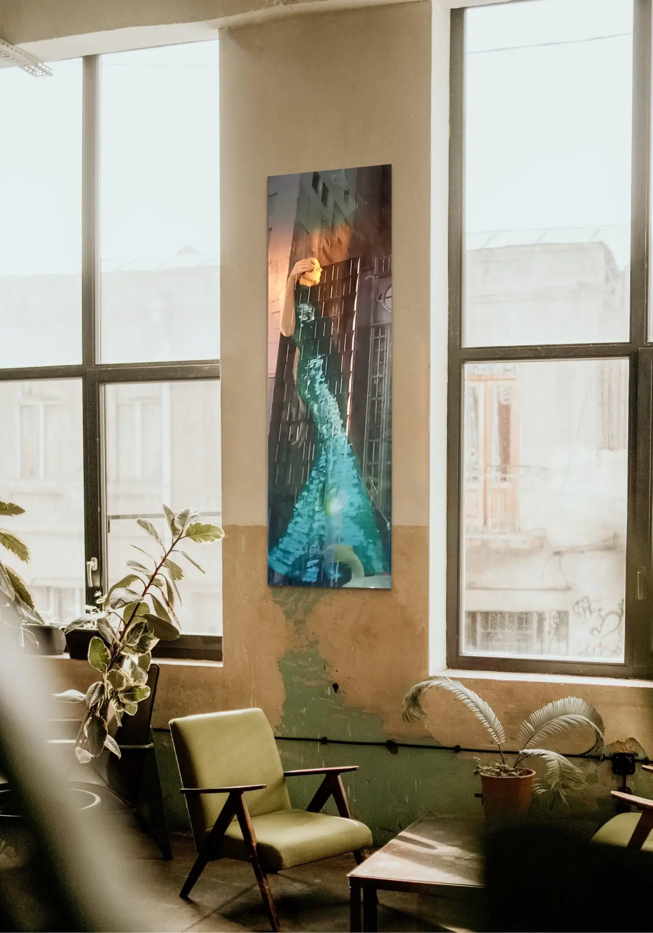 The brushed aluminium support for the print enhances the effect of the sharp angles and facets of the architectural details of the reflected building, transforming the photographed scene into a multifaceted piece. The facets of the building contrast with the blur of the moving figure’s sequins, forming this jewel of an image. The image’s mood undergoes subtle transformations with varying lighting conditions.