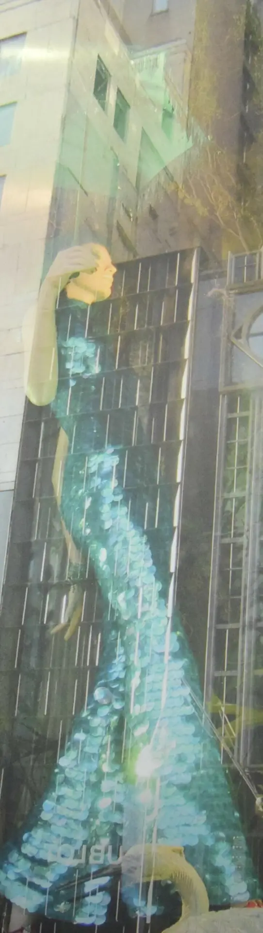 Contrary to initial impressions, the buildings are actually reflections superimposed onto the staged mannequin who gracefully walks a tightrope with a parasol. Gliding in a luminous turquoise sequins evening attire over the mirrored metallic grey building she accentuates the brushed metallic panel texture of the print and highlights the building’s 3-D faceted details, intensifying the overall metallic allure.