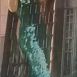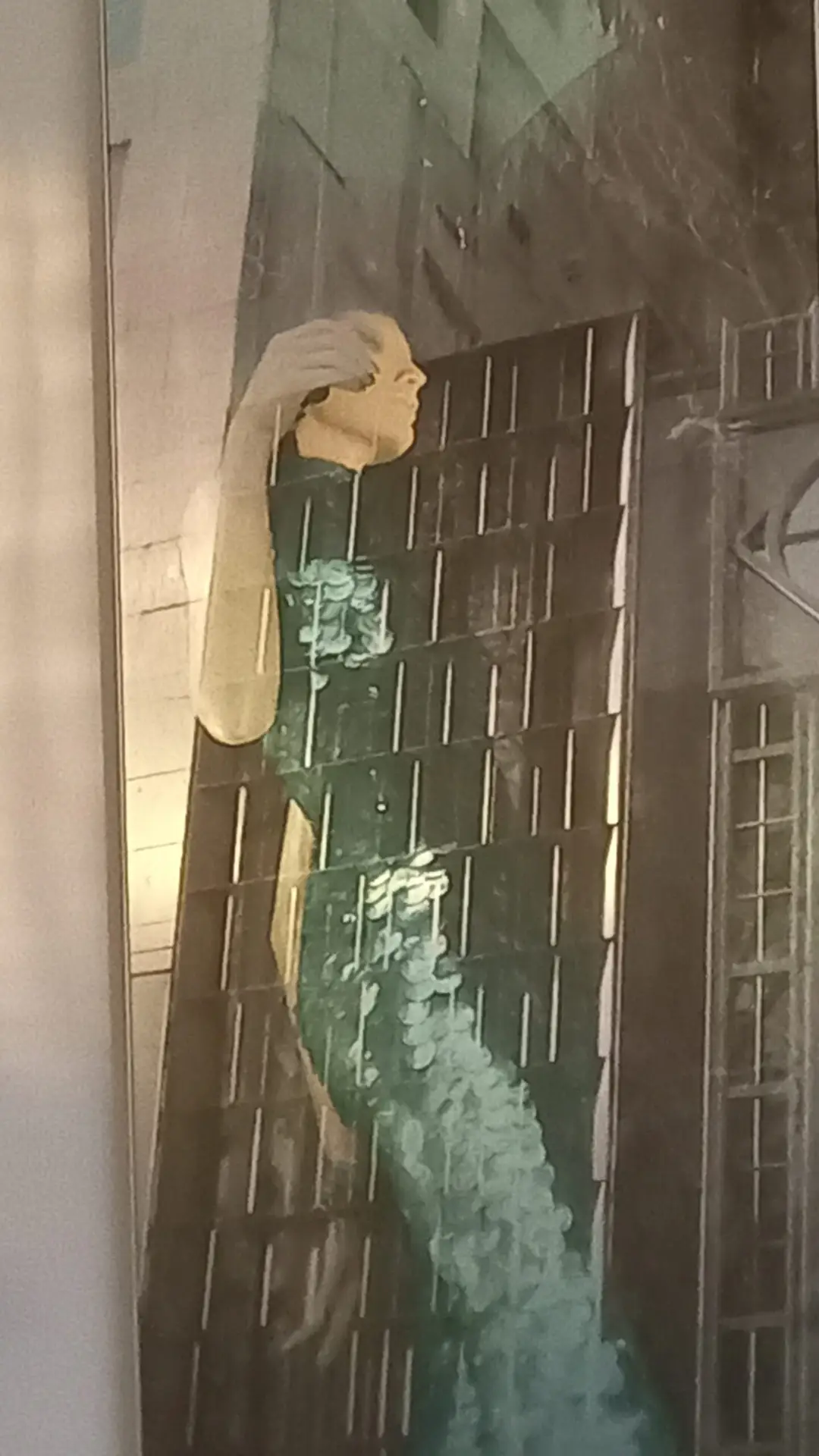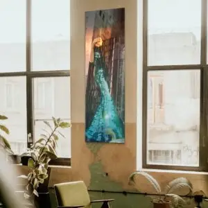 A captivating scene unfolds in a store window as a chic mannequin takes center stage, infusing an air of mystery into the surroundings. The unaltered image, printed on brushed aluminum, depicts a spectral figure seemingly suspended, hovering over a building.