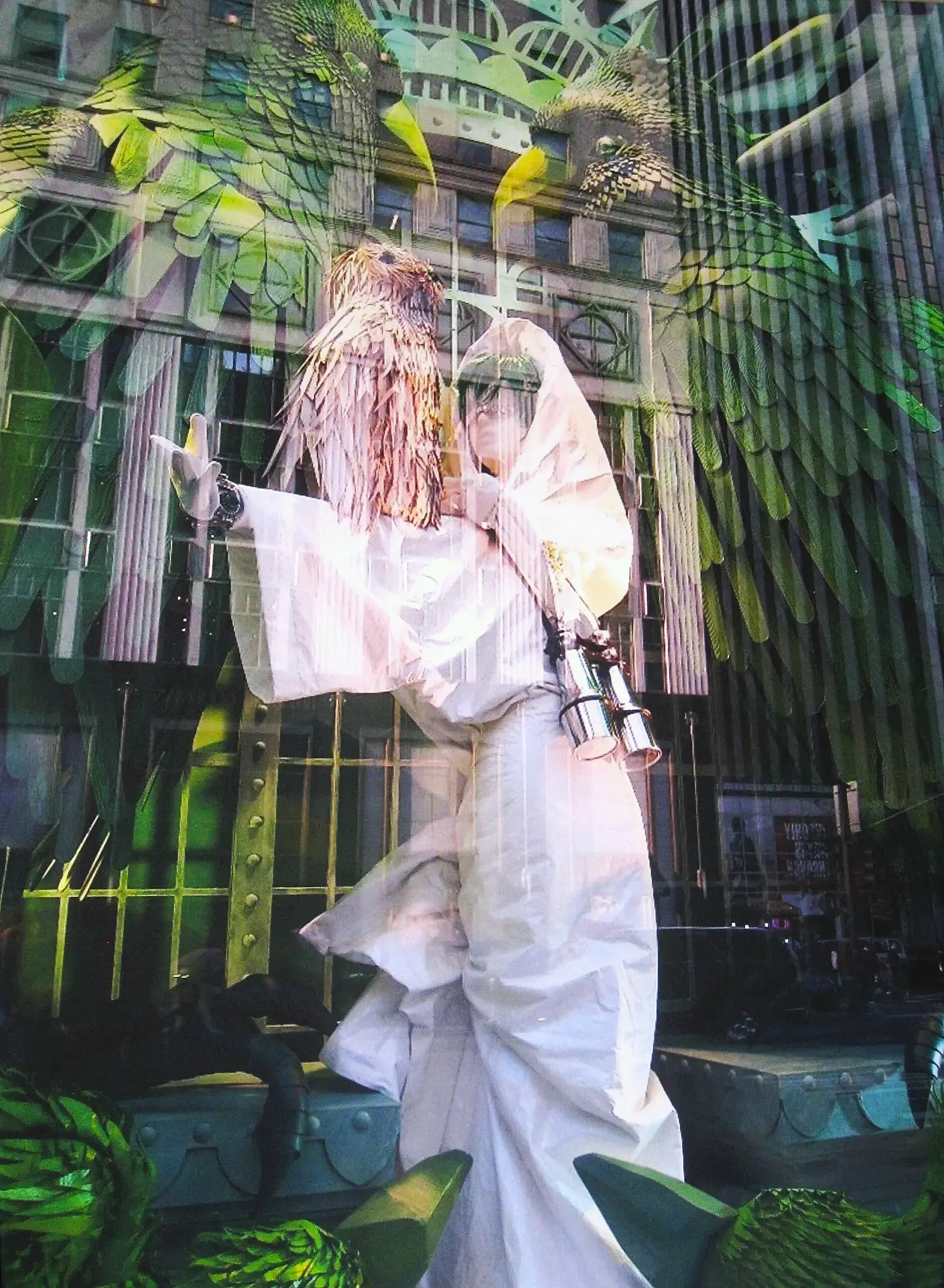 As a high priestess, the mannequin beckons mysteriously, surrounded by adoring feathered friends and closing buildings. This masked seer unifies, embodying style’s essence in an arresting and mystical presence.